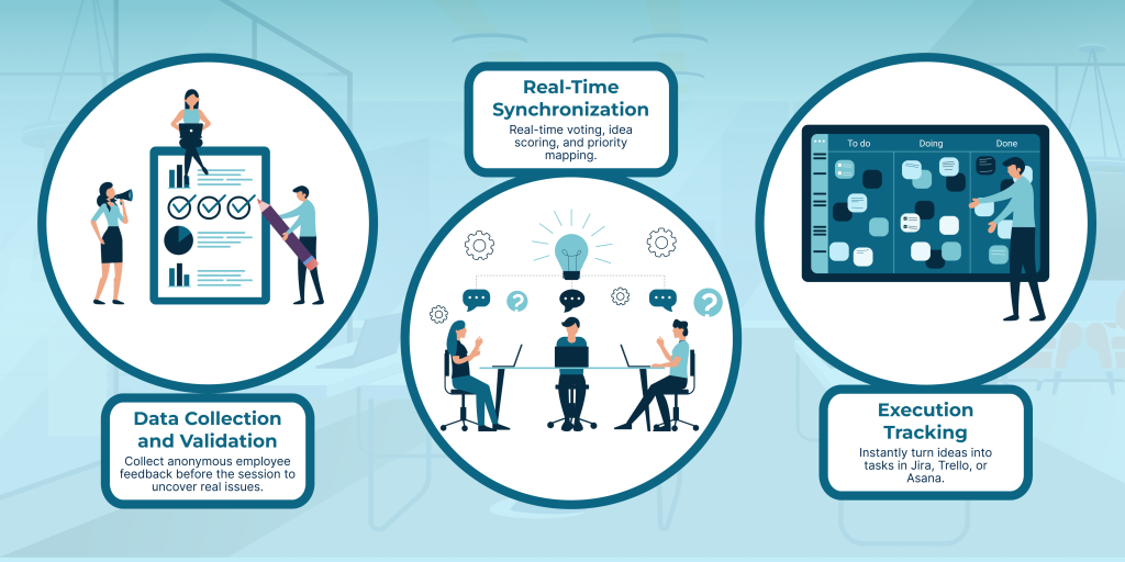 - Data Collection and Validation: Conducting anonymous employee surveys before the session begins to reveal real issues, not just the ones people are comfortable speaking about aloud.