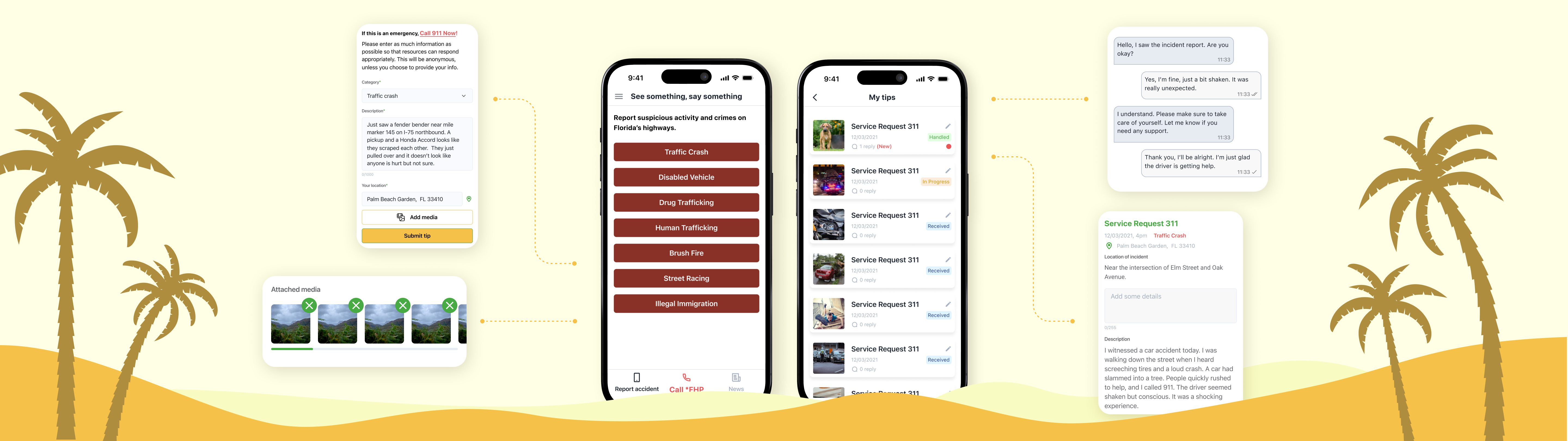 The solution delivers five key features: Non-Emergency Incident Reporting with anonymous submissions, My Tips for managing reports and communicating with the Florida Highway Patrol, Location-Based Alerts with real-time updates for selected counties, One-Tap Call to FHP for instant non-emergency contact, and a web-based Admin Panel for managing alerts, counties, and incoming reports.
